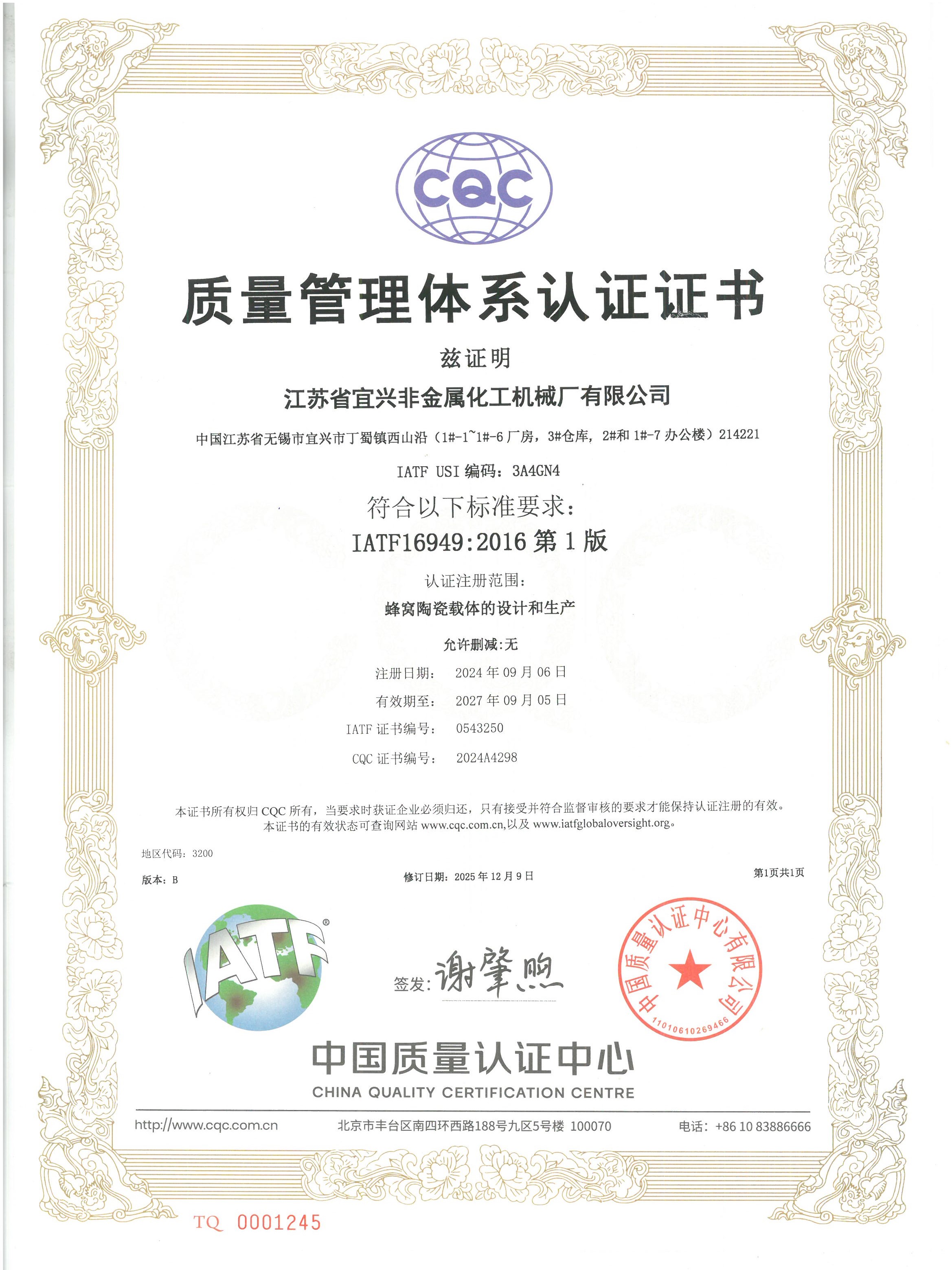 IATF16949质量管理体系认证证书-中文